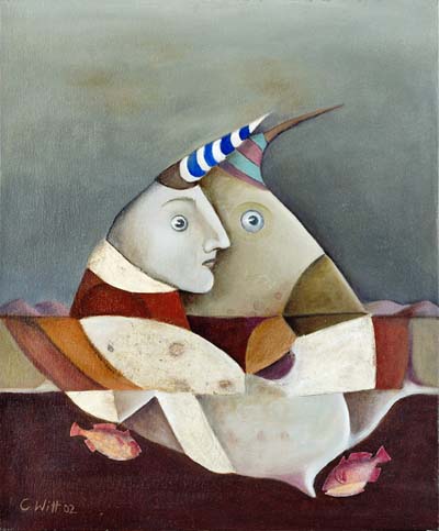 Ölbilder, Collagen, Zeichnungen 04. April - 18. Mai 2003 Nach ihrer ersten Ausstellung in der Galerie "Terzo" im Dezember 2000 hat sich bei Carla Witt ein ganz eigener - eigenwilliger - Stil entwickelt. Weniger graphisch bekam ihre Farbigkeit eine sandige, erdige Prägung, die Form wurde amorph, vereint sich jetzt stärker mit der Fläche. Seit drei Jahren hat die diplomierte Porzellandesignerin ein neues Medium für sich entdeckt. Carla Witt beobachtet die Welt. Es ist eine spielerische Welt, manchmal spürt man den Einfluss ihres Lehrers Martin Dittberner. Die Verarbeitung von Alltagseindrücken und zwischenmenschlichen Konflikten gerät bei ihr nur weniger melancholisch, oft eher bissig: ..."etwas stichelt" ... Aus den Assoziationen zu Farbe und Form erwachsen Figuren, Insekten, Fische in Phantasiewelten mit frei agierenden Augen. Ein neu erwachtes Ausdrucksbedürfnis führte Carla Witt - sie selbst überraschend - zu phasenweise fast manischer Produktion. Das Malen wurde zur Notwendigkeit. Anita Staud