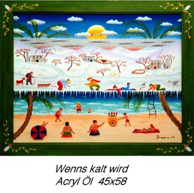 Poetische Malerei Ausstellung vom 08. - 24. April 2005 Geöffnet Mittwoch-Montag von 18:30 - 23:00 Uhr und nach Vereinbarung Eva Drosera Weisse 1928 in Berlin geboren. Abitur Schauspielschule Ballettunterricht Sängerin Synchronsprecherin 2 Söhne 1963 Übersiedlung nach München Arbeit im Filmstudio Bavaria Mal-und Zeichenunterricht in Privat-Schulen. 1974 Übersiedlung nach Frankreich. Intensives Farbstudium beim Sohn Markus Anatol Weisse. Eines Tages entschlossen, ihre Lyrik nicht mehr zu verbrennen (im schönen Kamin), ihre Bilder nicht mehr zu zerreißen (weil jemand sie ausstellen wollte). Erste Ausstellungen im Languedoc (Agde, Beziérs, Montpellier u.a.). Dann in Paris Salon d´Automne Grand Palais. Goldmedaille in Cannes Galerie Hamer in Amsterdam Kunst und Keramik-Galerie, Berlin Galerie Terzo , Berlin 2005