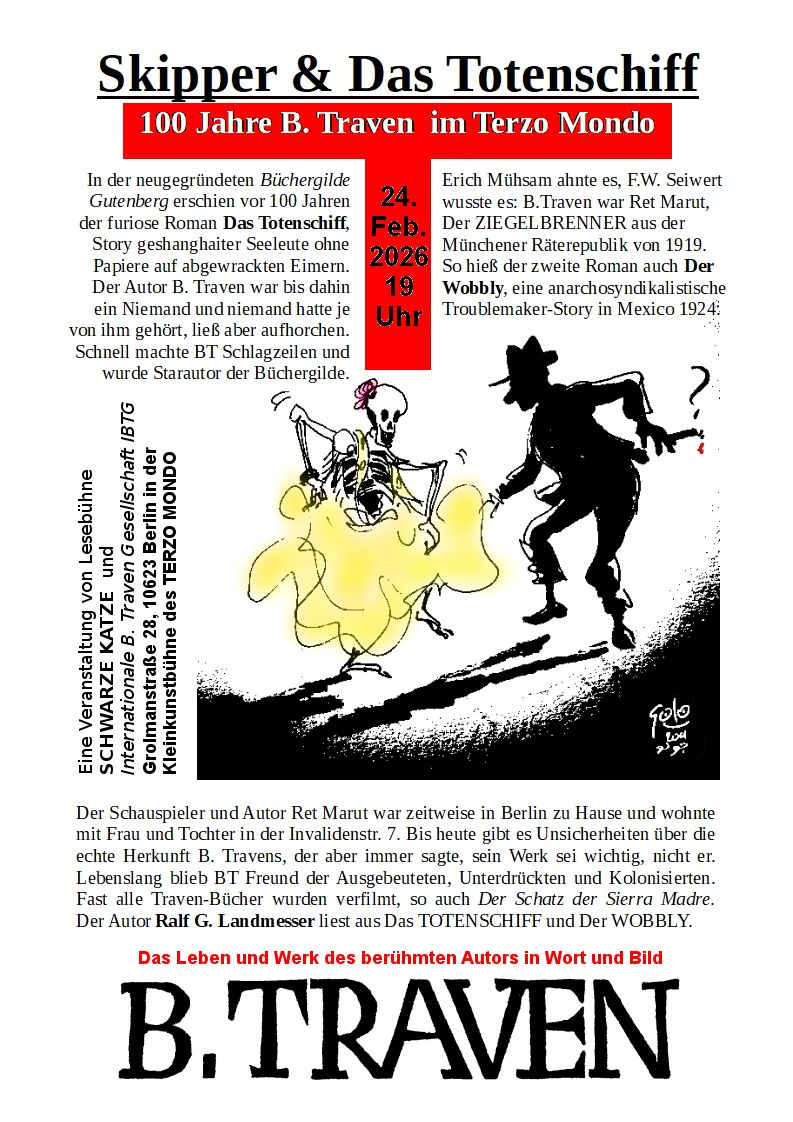 Ralf G. Landmesser, Autor des Abends und Präsident der Internationalen B. Traven Gesellschaft, ist als Publizist, Politikwissenschaftler, Dichter und Bildender Künstler mehr als andere dazu berufen, uns das labyrinthische Leben, das überzeugende Werk von B. Traven, zwölf Romane und weitere Erzählungen, die vielfach verfilmt worden sind, ausführlich zu erläutern (siehe Plakat als Anlage).