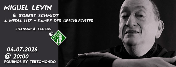 " A MEDIA LUZ - ZWIELICHT - KAMPF DER GESCHLECHTER EIN TANGO - CHANSON ABEND Miguel Levin, Argentinier deutscher Abstammung, Deutscher argentinischer Abstammung lädt ein, den Kampf der Geschlechter während seiner Darbietung verschiedener Tangos und Chansons beizuwohnen. Im Zwielicht, im Halbhellen, Halbdunklen begegnen sich beide Geschlechterhälften und tragen ihr jahrtausendalter Kampf aus, durch Levins Tango […]